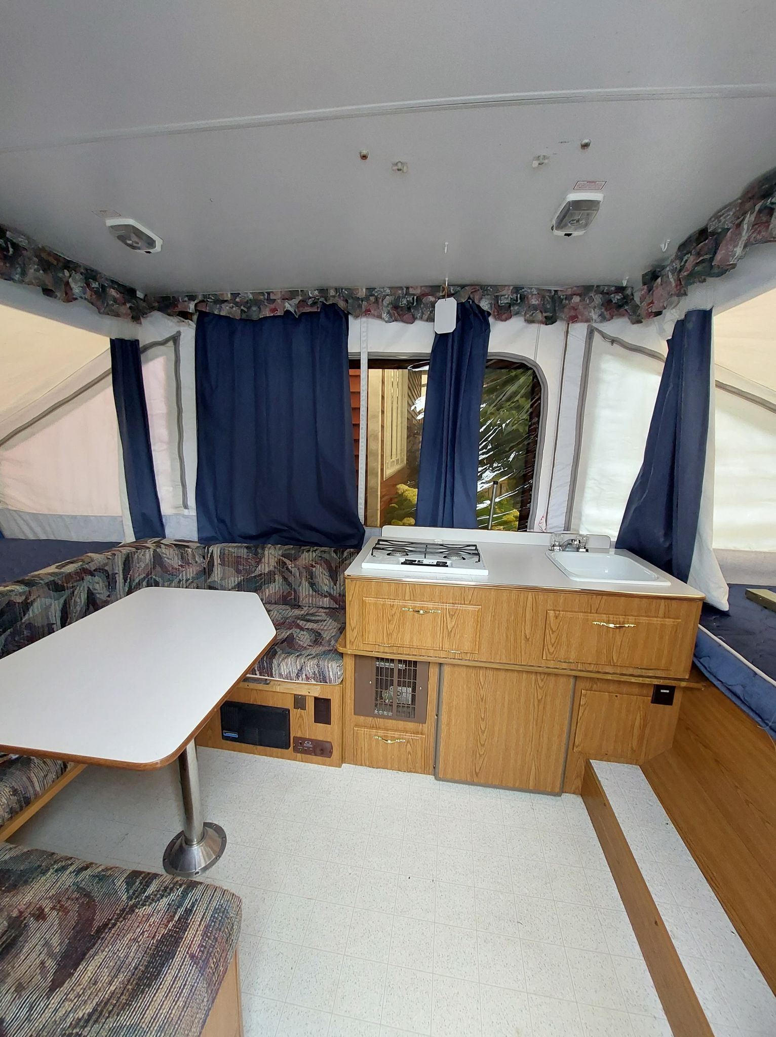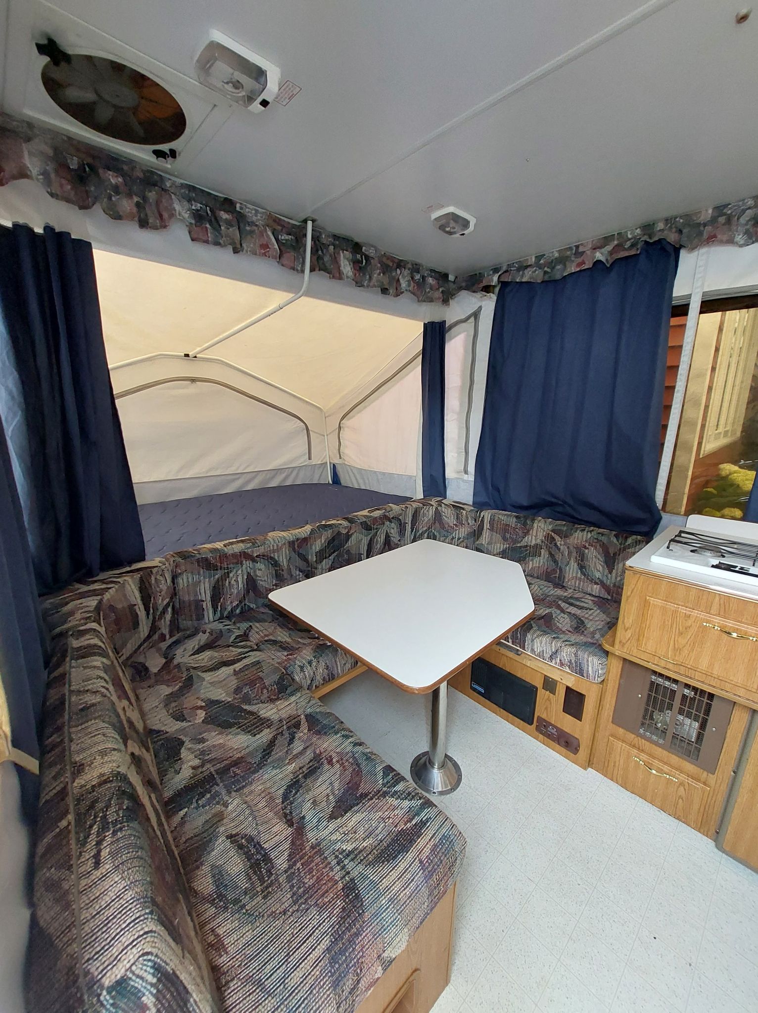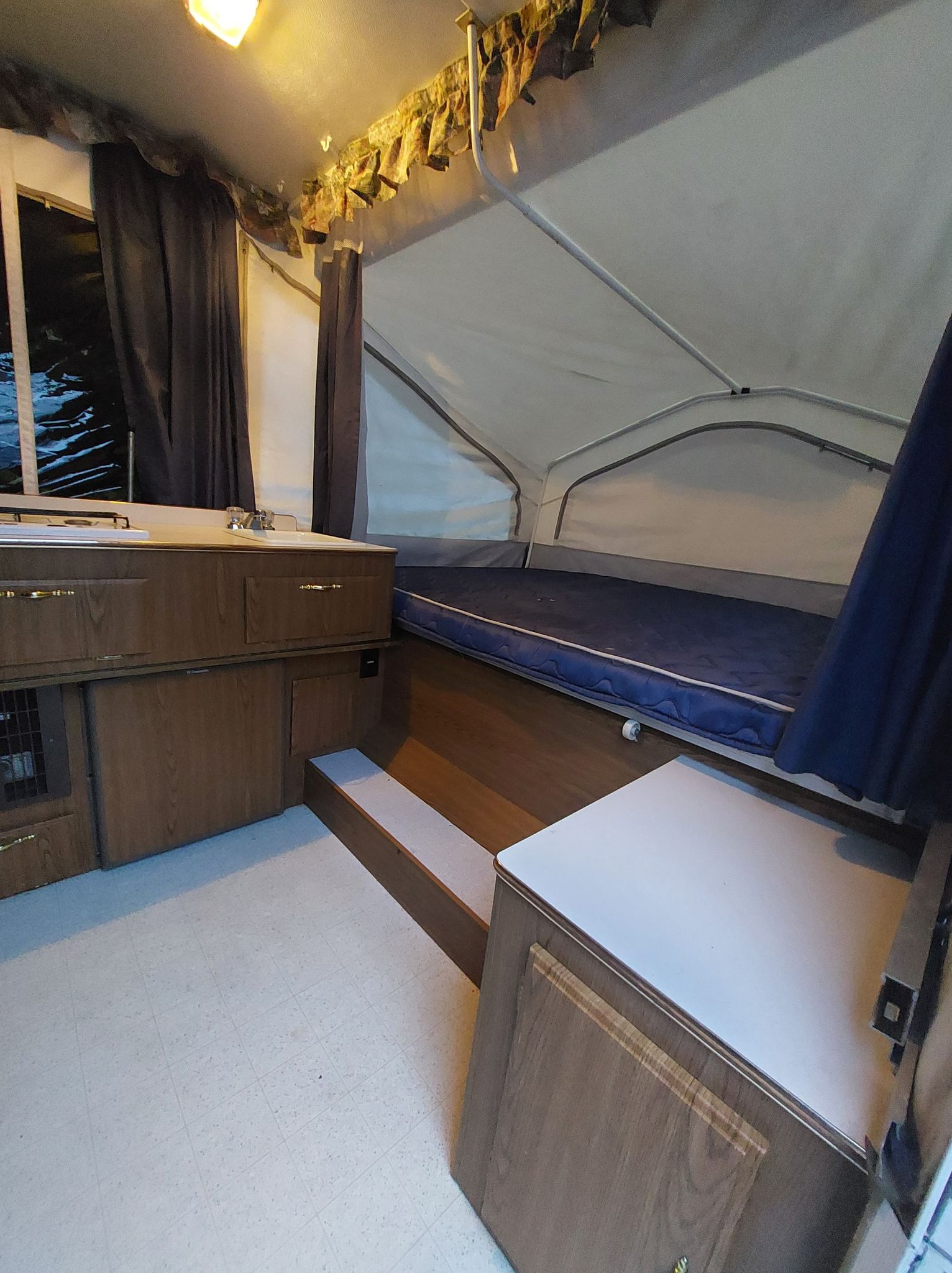 1 lit double (54’’) 1 lit double (54’’) – table qui se transforme en lit 1 lit simple (39’’) 1 Réfrigérateur, poêle, lavabo et chauffage