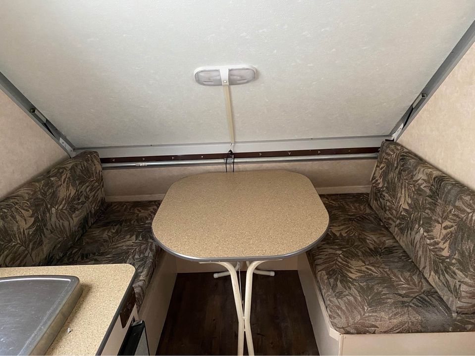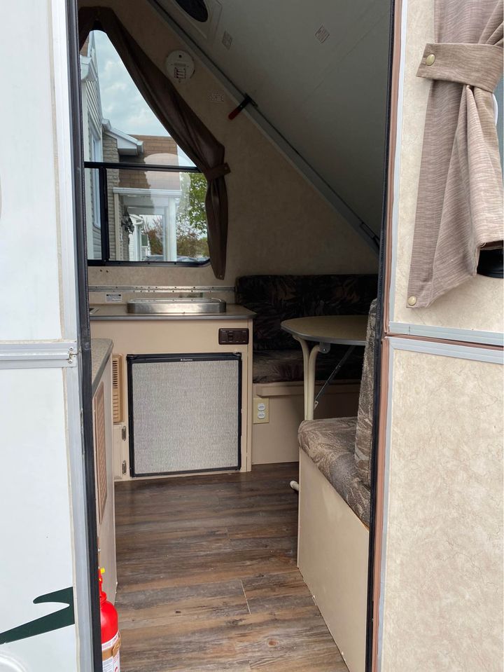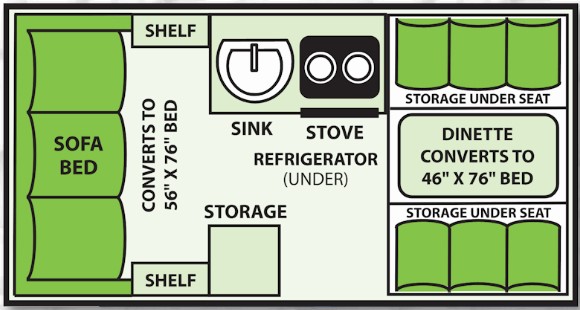 1 lit double (54’’) 1 lit double (39’’) – table qui se transforme en lit 1 Réfrigérateur, poêle, lavabo et chauffage